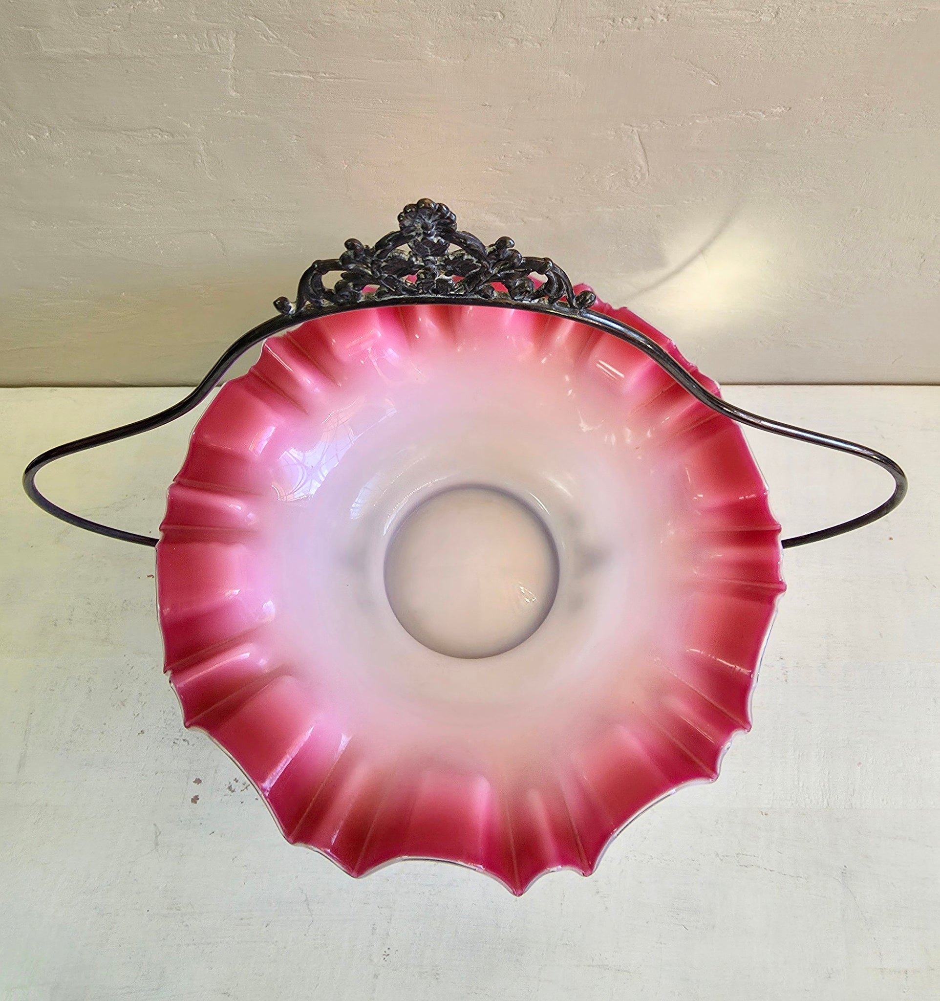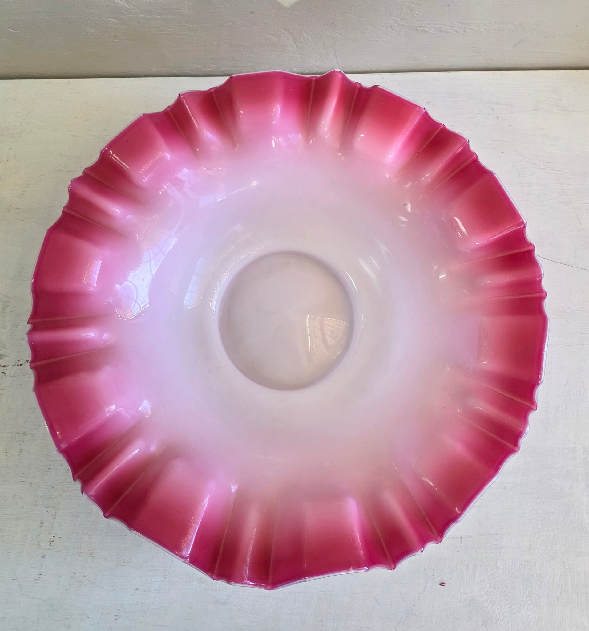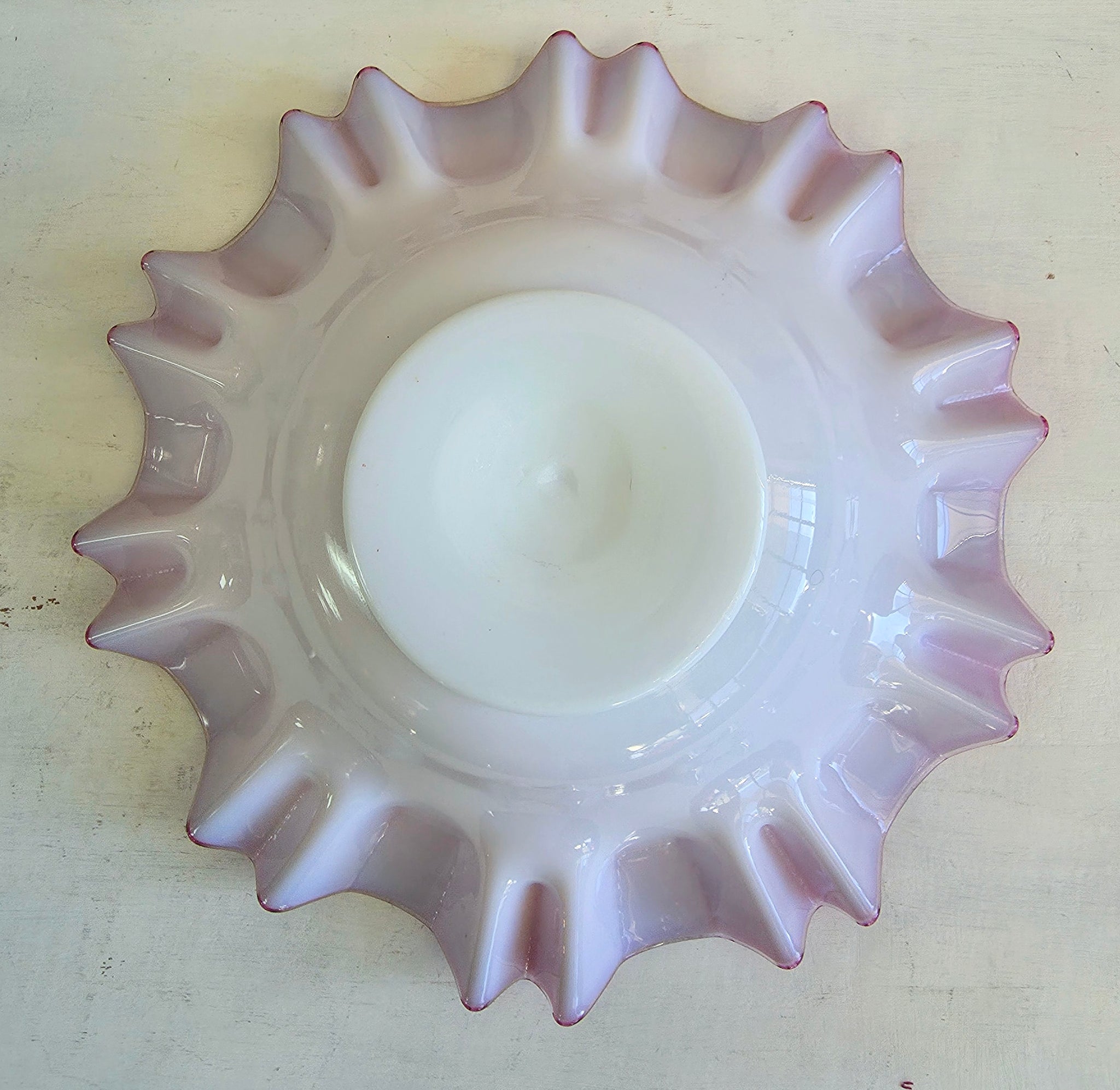Glass dish is in good condition. White center to graduating to darker cranberry ruffled edges.