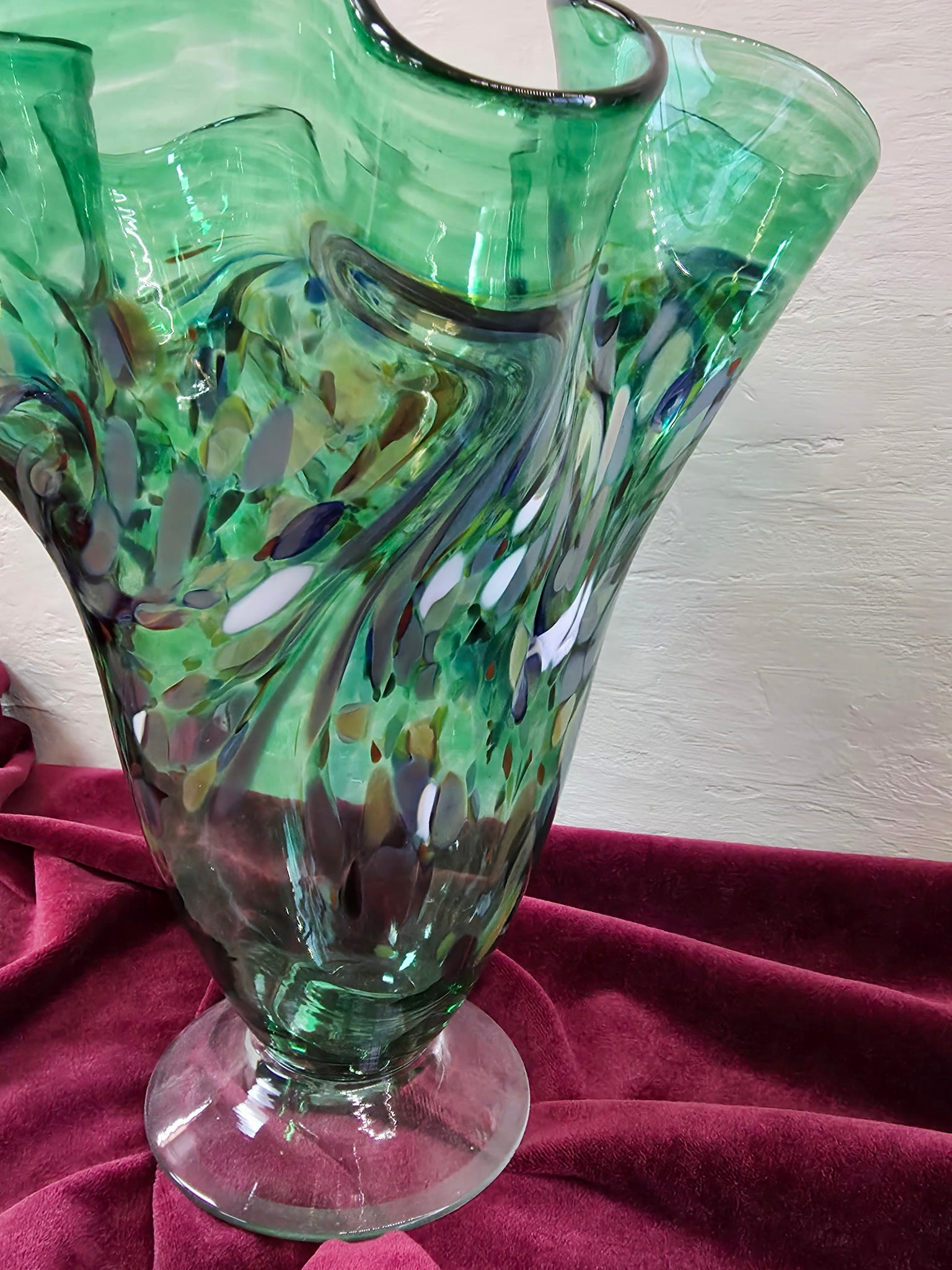 Green art glass vase with ruffled lettuce edge. Signed Arte Vargas on base.