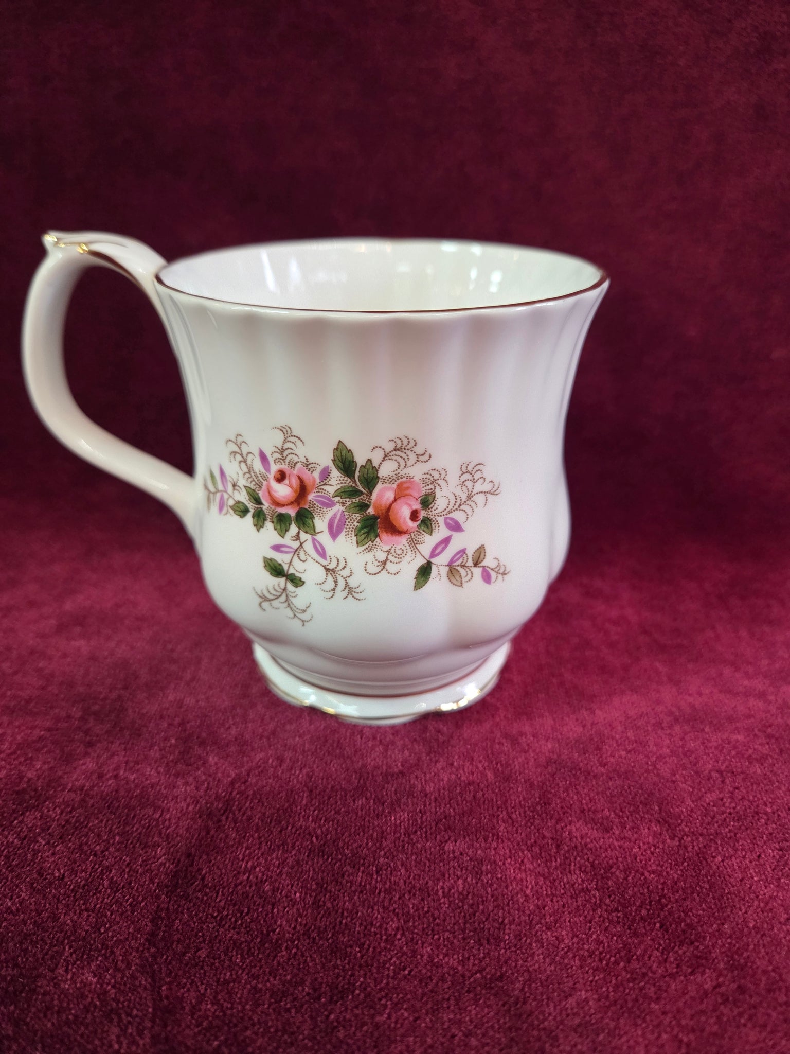 Royal Albert Lavender Rose coffee mugs were produced from 1961 to 2009 and feature delicate pink rose bouquets, lavender tinged foliage & gold trim. These mugs are the montrose shape. The Montrose shape features a curved, tapered wall, flared rim, and a high-arched handle.