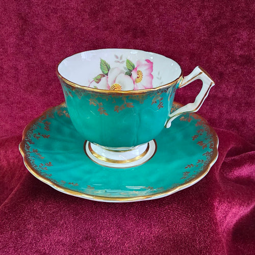 Aynsley “Cabbage Rose” Emerald Green Bone China Teacup and Saucer Set #42505