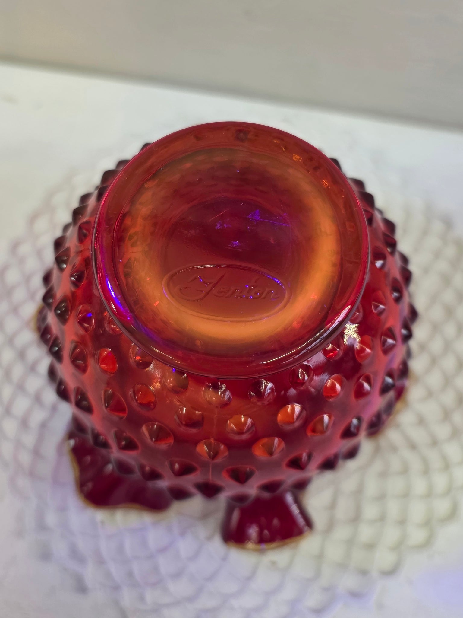 Vintage Fenton Red & Amberina hobnail vase with ruffled edge.