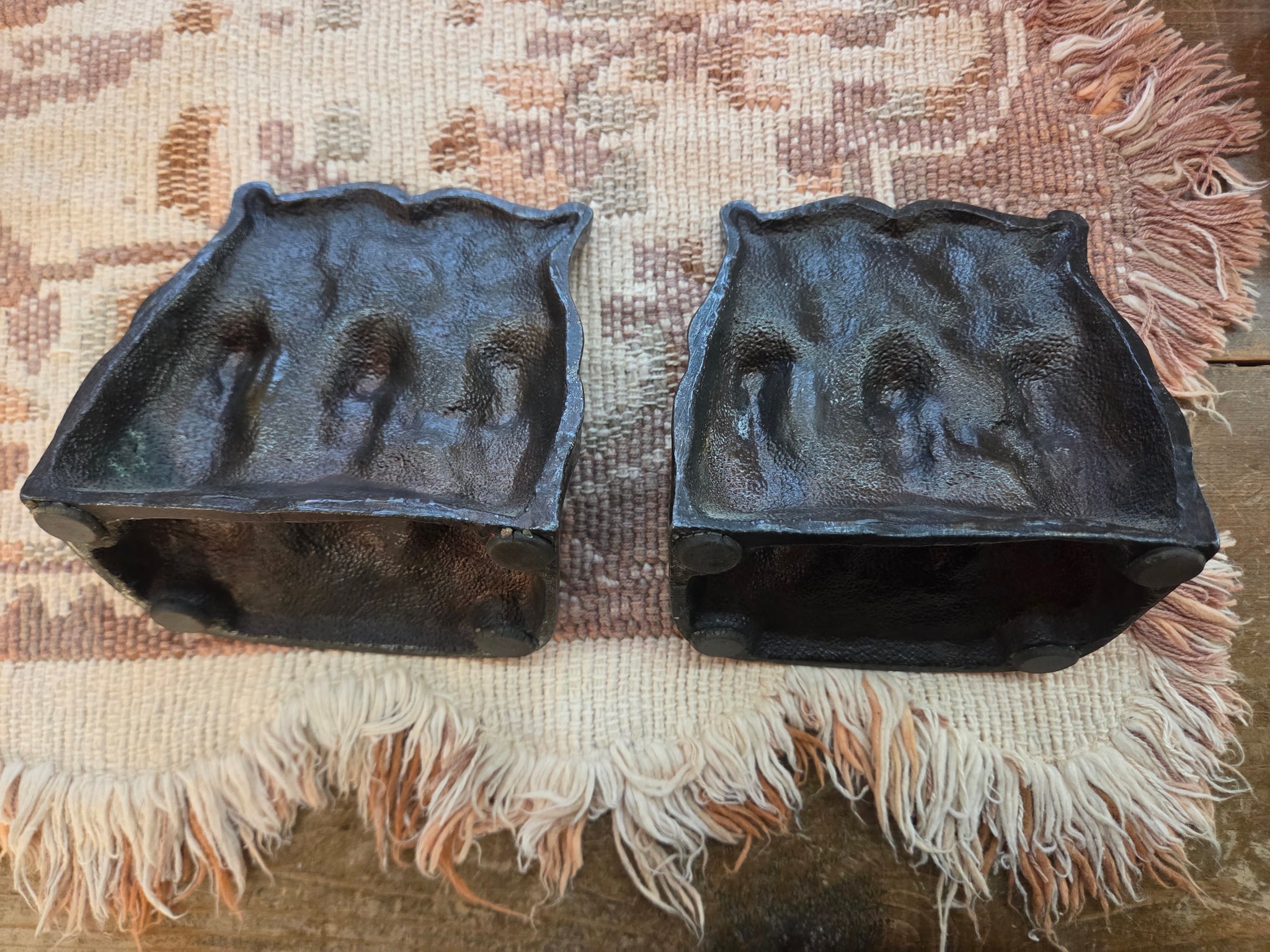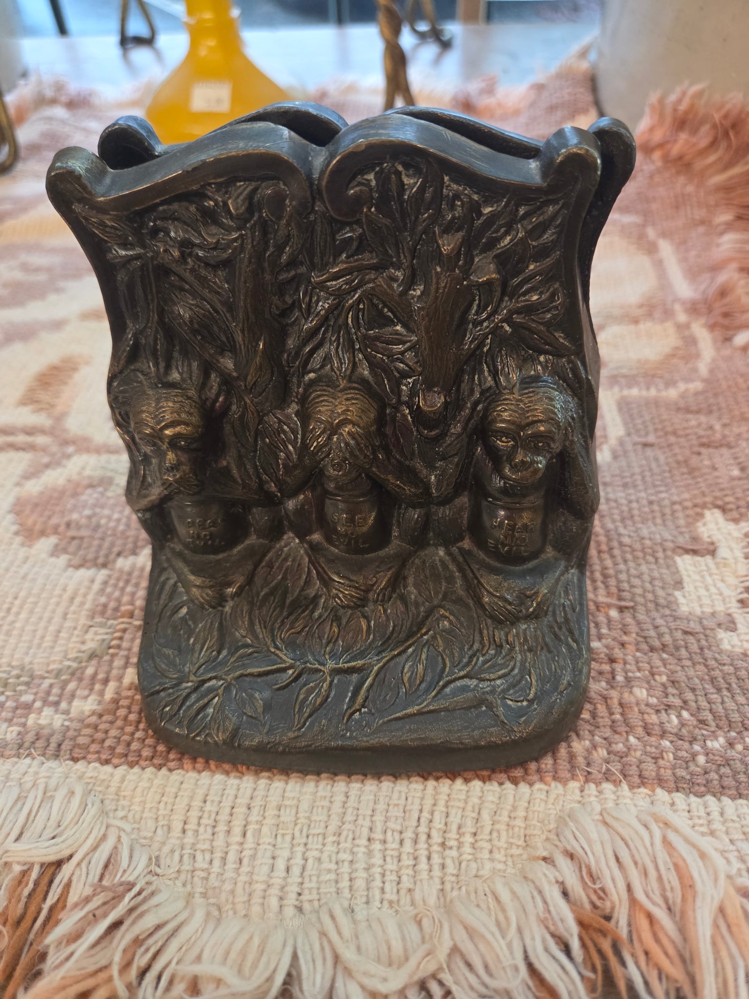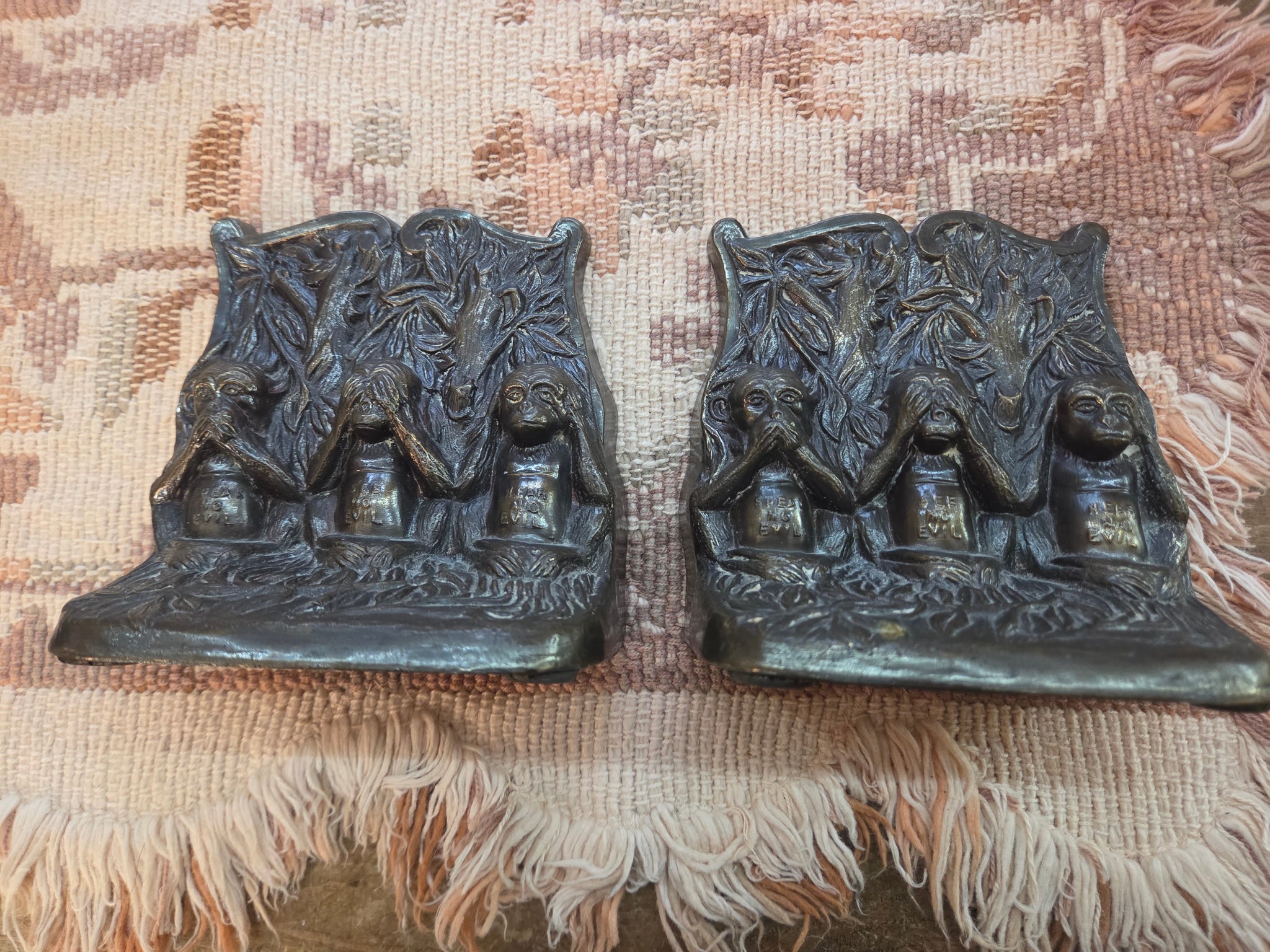 Vintage Brass Book Ends with Embossed Monkeys in a "see no evil, hear no evil, speak no evil" pose. Great electic item for library or displaying favourite books.