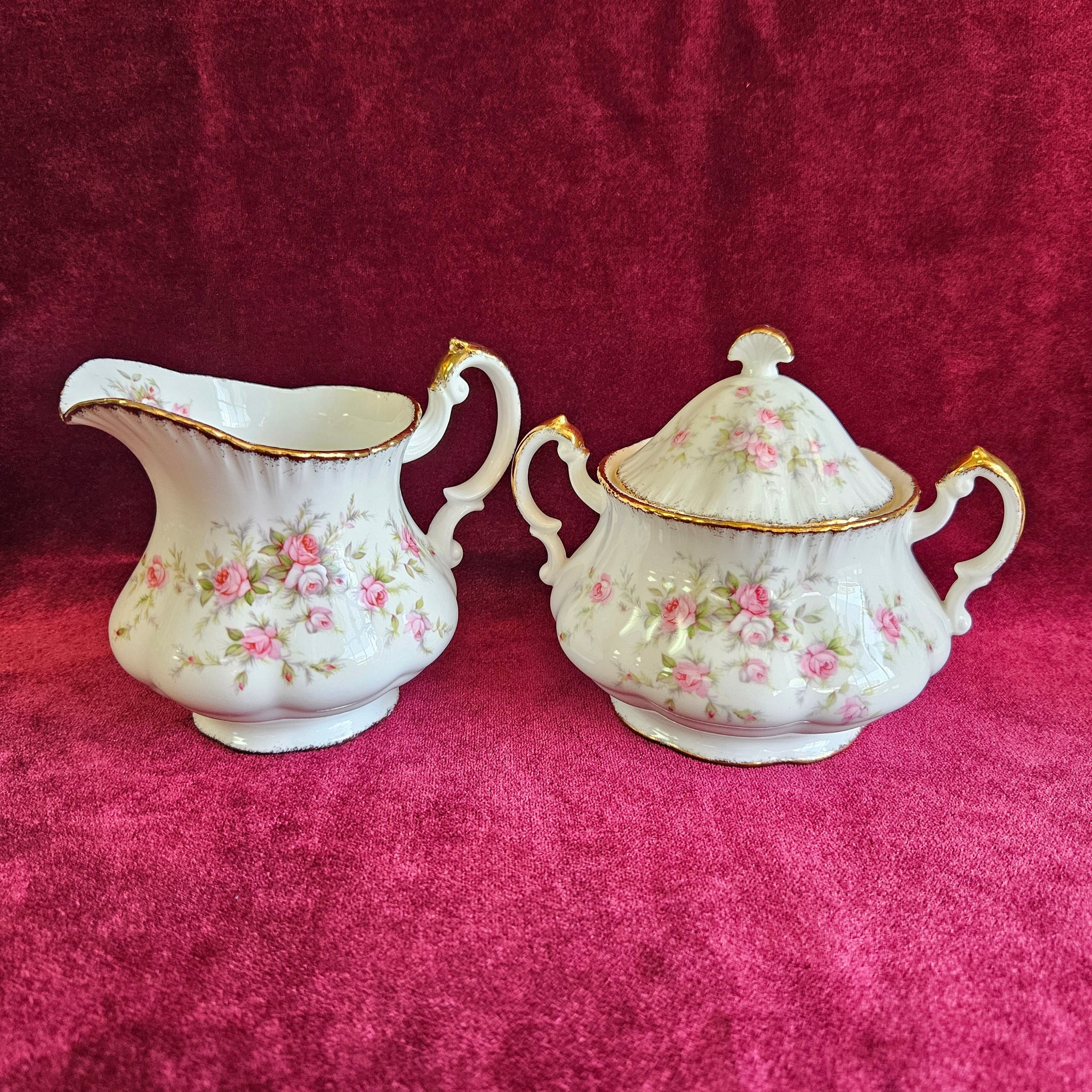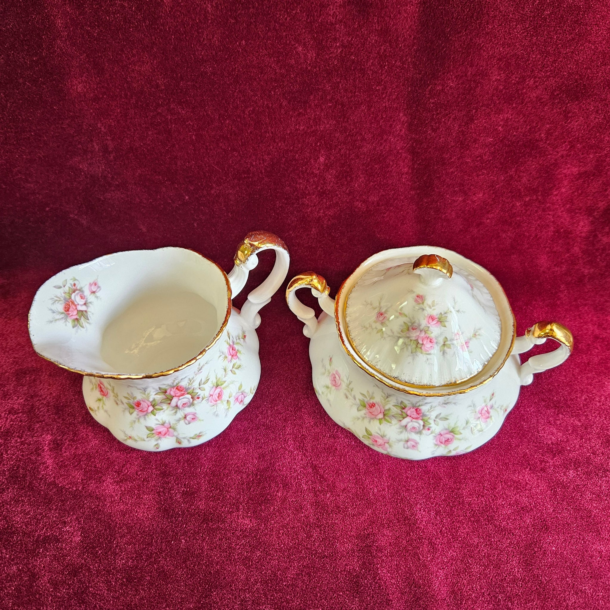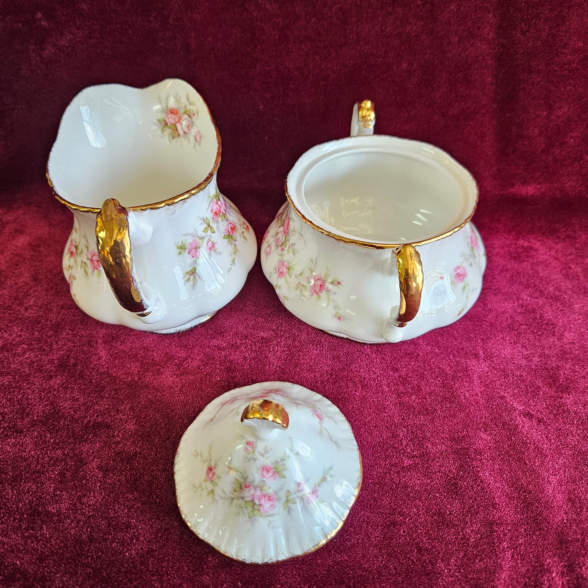 Vintage Paragon "Victoriana Rose" cream and sugar set with lids. Features rose pattern throughout. No chips or cracks, minor scratches on gold trim. See photos for condition details.